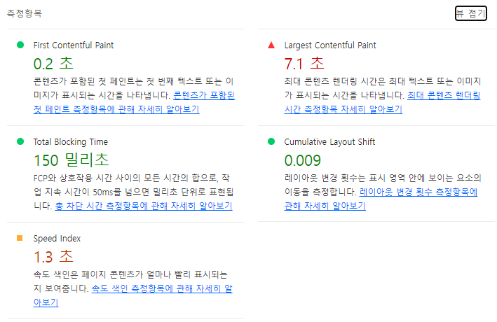 Largest contentful Paint가 7.1초나 걸렸다.
