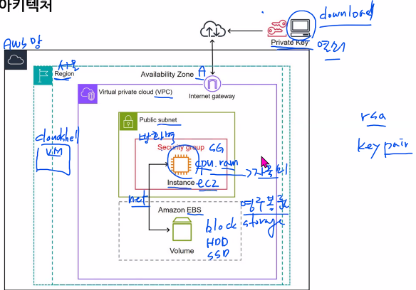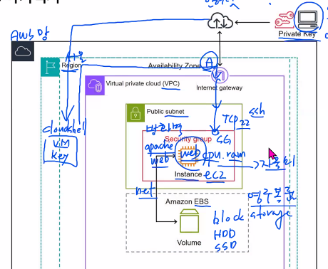 클라우드쉘 -> EC2 접근 시 TCP 22포트 (ssh) 열려야 , 접근 가능하다.
