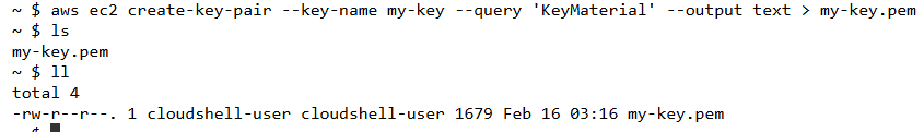 aws ec2 create-key-pair --key-name my-key --query 'KeyMaterial' --output text > my-key.pem