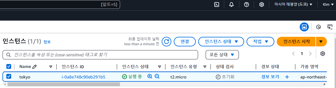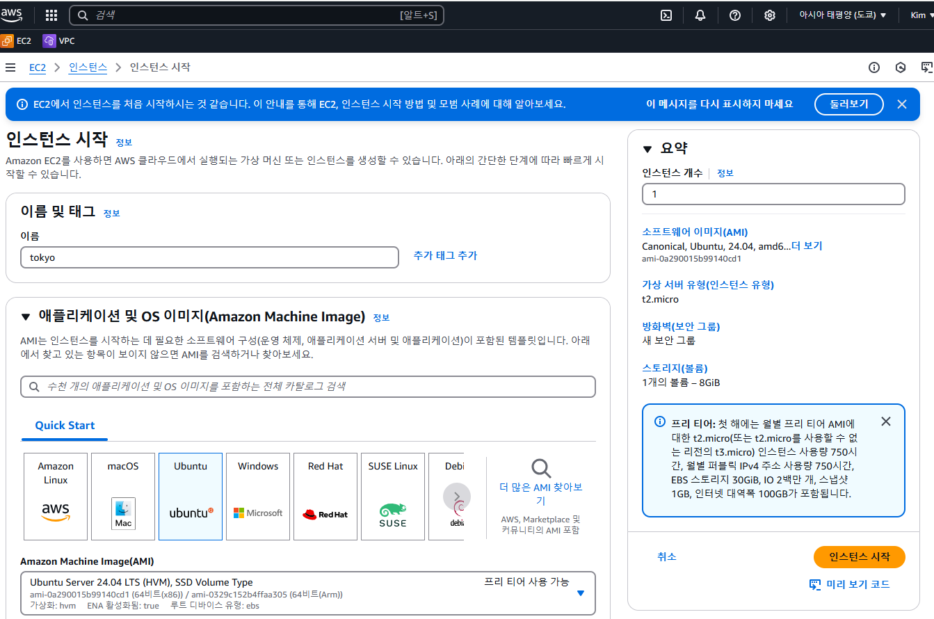 도쿄 리전으로 인스턴스 제작