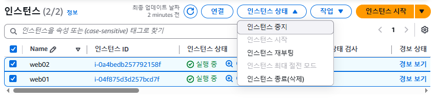 ec2 스타트 (저번에 만들어놓은거 두개 체크하고 인스턴스 시작 )