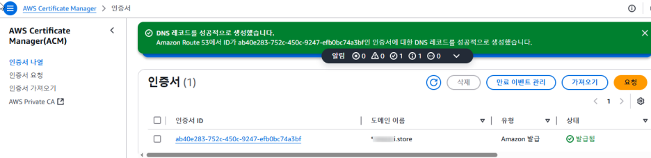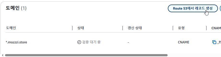 검증 대기중 이라고 뜨는데 .. 밑에 있는 Route 53에서 레코드 생성을 클릭한다.