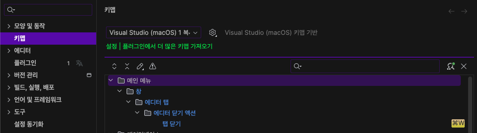 키맵 > 메인메뉴 > 창 > 에디터 탭 > 에디터 닫기 액션 > 탭 닫기