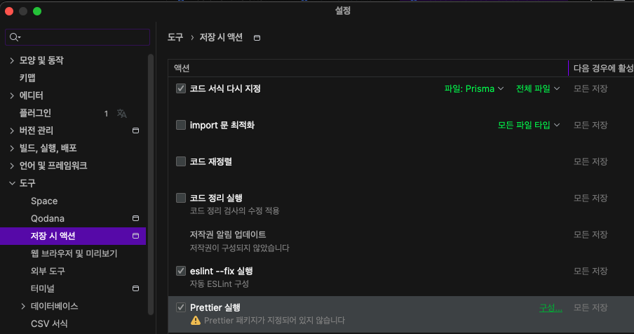 Prettier > 자동 프리티어 구성 > 저장 시 실행 체크