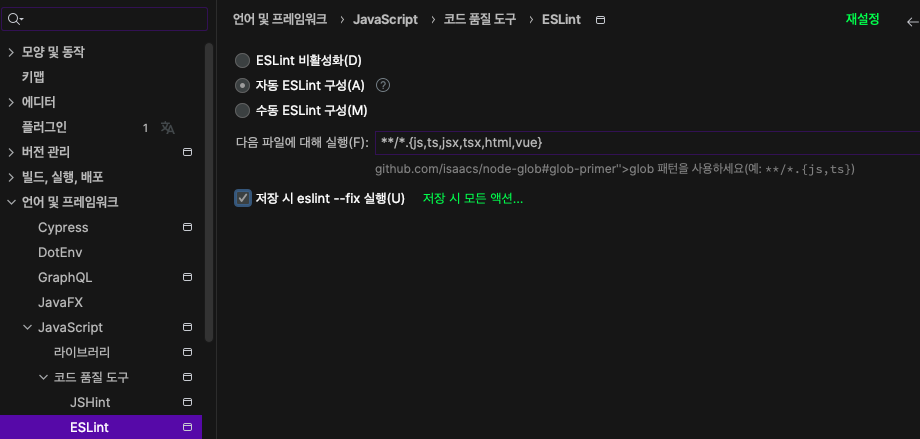 언어 및 프레임워크 > javascript > 코드 품질 도구 > EsLint 저장 시 실행 체크